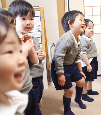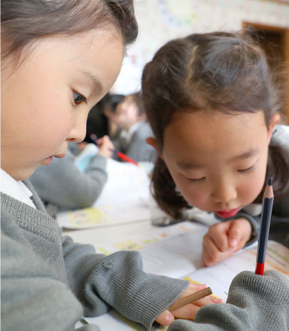 言語の習得期」といわれるこの時期から徐々に取り入れることで、年少学齢後半から年中学齢の頃には自然とお友だち同士で短い内容の手紙を交換したり、クラスで自分の意見を発表できたりする程の「Composition(作文)」能力を身につけています。