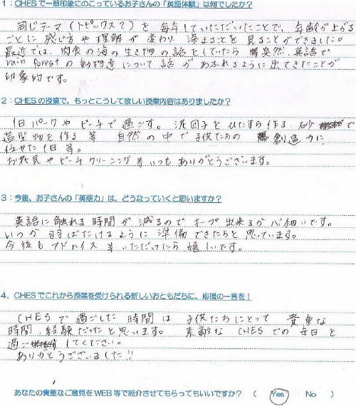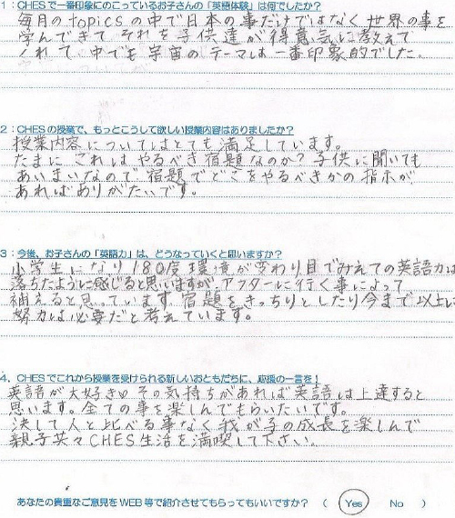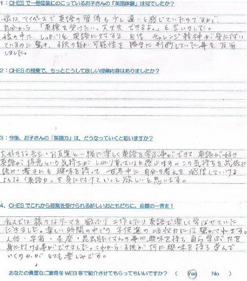 CHESへは週1回の通学でしたが、塾のように成績をつけられる訳でも押し付けられる訳でもなく、自然と力をつけていただけた事に感謝の気持ちでいっぱいです。本当にありがとうございました。