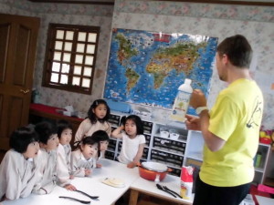 5月、他にもCHESの教室ではさまざまな「体験」をすることができました。ある日のこと、ヤン先生がみんなの前でサラダオイルをもってなにやら説明を始めます。テーブルの上には、大きなお鍋、小麦粉、塩、そして大きなフォークとスプーンが用意されている。もうこうなると…、恒例のCooking Party!?
